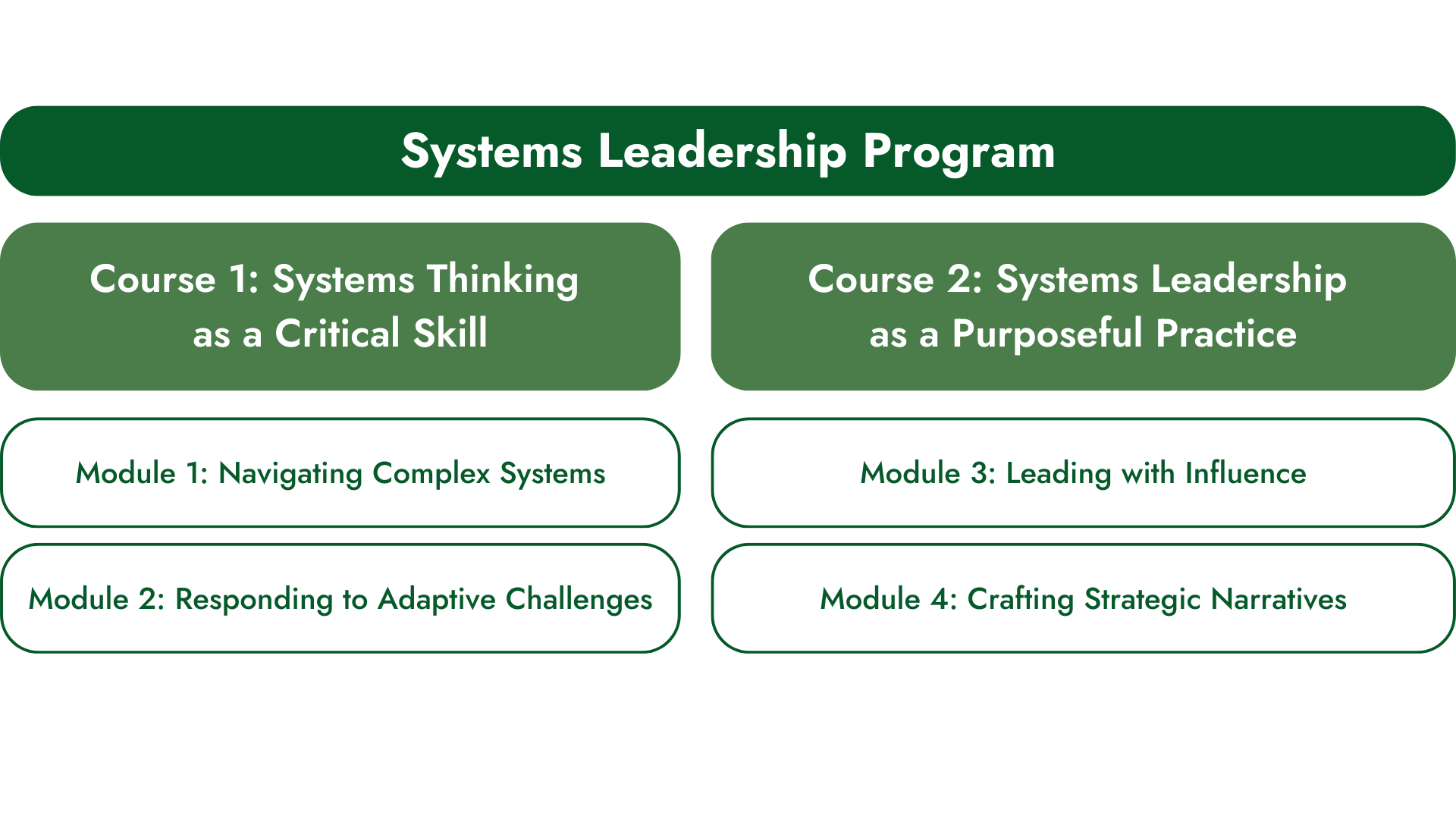 The Systems Leadership Certificate Program consists of two courses taught in two modules each. Each module represents two hours of synchronous learning, amounting to eight hours of active class participation to complete the program.