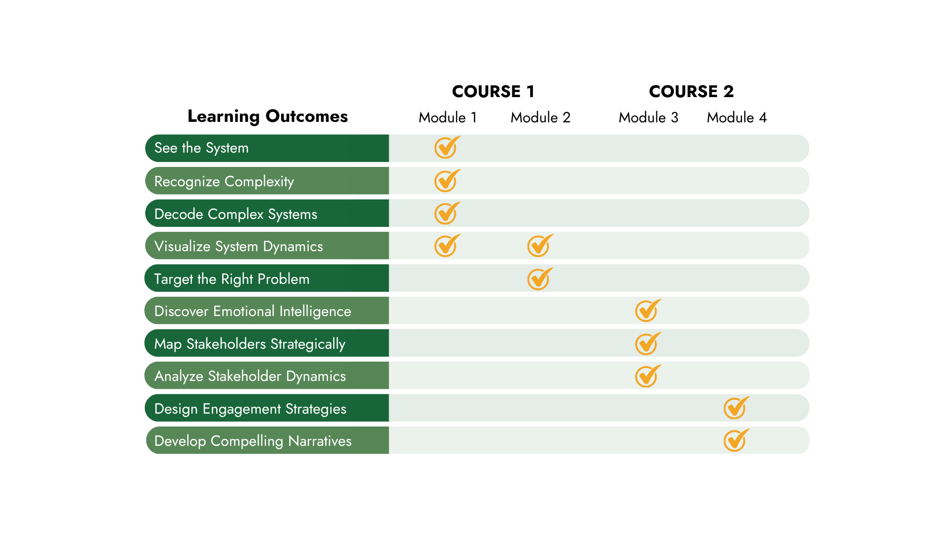 Course 1 - Systems Thinking as a Critical Skill focuses on providing learners with the foundational tools of a systems thinker and demonstrating the relevance of systems thinking when solving complex problems: